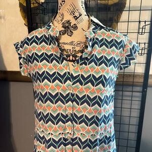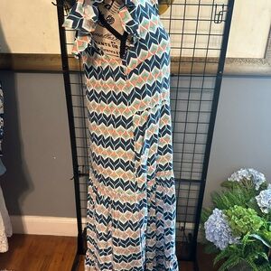 Step out in style with this chic chevron midi dress, featuring a stunning blend of blue and white. Perfect for any occasion, it offers a flattering fit and timeless design. Msrp $585. Too about 18.5". Length about 56"