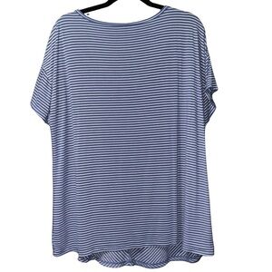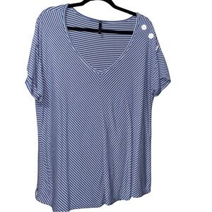 This top showcases a relaxed fit with a buttoned detail, crafted in a blue and white color palette with slimming design. The short sleeves add to its casual charm, making it a versatile piece for any occasion. Made in the USA.