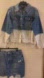 Stylish denim jacket and skirt set in blue and white. Features a trendy dip-dye design.