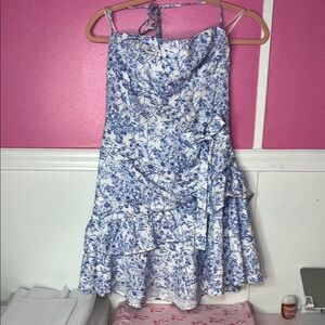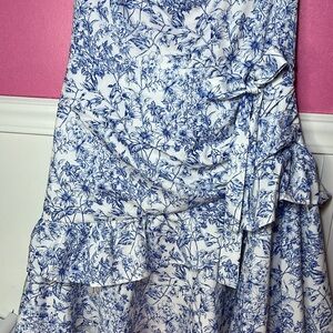 Elegant blue and white floral dress with ruffle details. Perfect for any occasion.