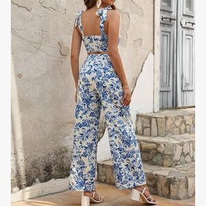 Blue and White Floral Print - Crop Cami & Pant Set - XS