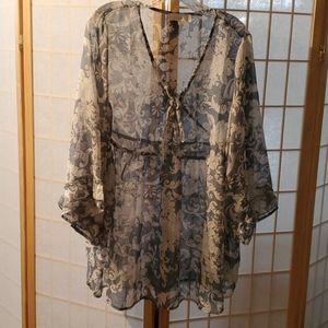Blue and White Floral V-Neck Tie Front Three Quarter Length Sleeve Tunic - Will Sell in a Bundle with Another Tunic or Any Other Item on My Page