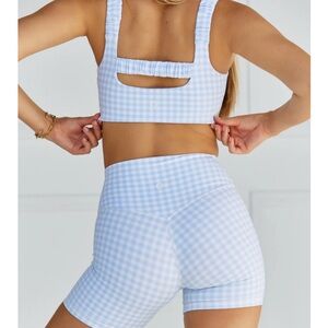 Stylish blue and white gingham sports bra and shorts set. Perfect for workouts or casual wear.