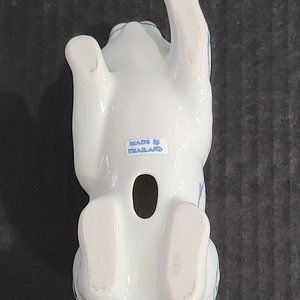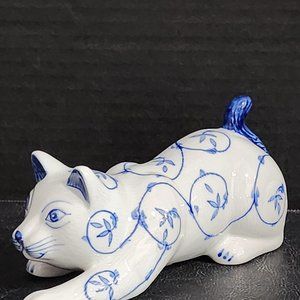 Hand painted blue and white porcelain cat made in Thailand. The white porcelain is hand painted with a pretty swirl, vine leaf pattern. The eyes, ears and tail are finished with blue accents. It is an excellent vintage condition. No chips, nicks, cracks, Etc. Measure 7.25 inches long, 3 inches wide. 3.5 inches high. Non smoking, pet free home.