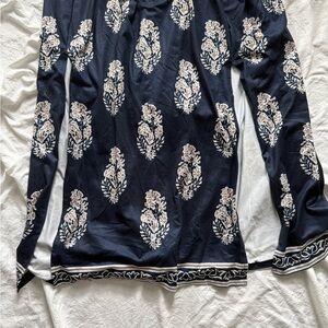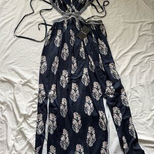 This sleeveless maxi sundress features a striking blue and white pattern, perfect for resort wear. The plunging neckline and thigh-high slit add a touch of drama, while the flowing skirt ensures a breezy silhouette.