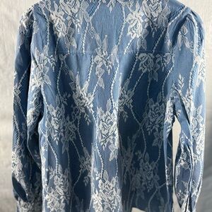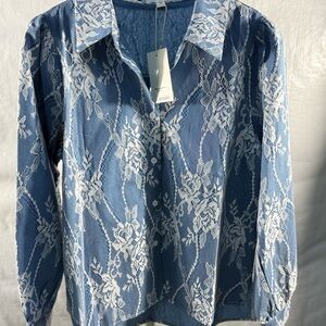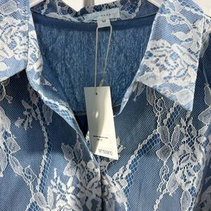 Blue and White Mesh Embroidered Blouse Elegant Top