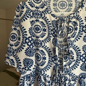 Stylish dress with a blue and white pattern. Features a lace-up front detail.
