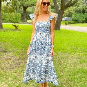 Elegant blue and white patterned dress perfect for any occasion. Features a stylish design with comfortable fit.