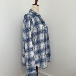 Stylish blue and white plaid button-up shirt. Features a classic collar and front pocket. Perfect for casual wear.