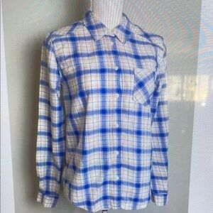 Stylish blue and white plaid button-up shirt. Features a classic collar and chest pocket.