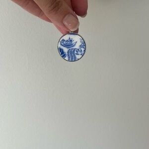 Elegant blue and white porcelain pendant featuring a delicate design. Perfect for adding a touch of sophistication to any outfit. I handmade these pendants and professional grind the dish down into a piece that fits into the silver pendant. This is pendant only, no chain. I ship out in 1-2 days!