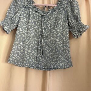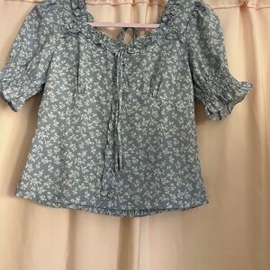 This charming blouse features short puff sleeves and a bib collar, enhanced by a ruffled tie front and smocked bodice. The delicate blue and white color palette adds a touch of elegance to its cottagecore-inspired design.