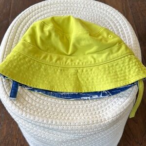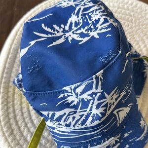 Stylish blue bucket hat with white tropical print. Perfect for sunny days. Size: Toddler. No size listed. Reversible to neon yellow. Velcro strap. Preloved. Condition as pictured.