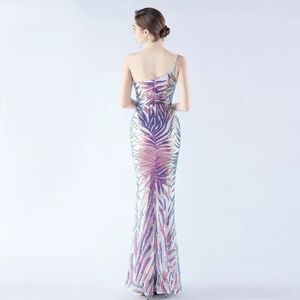 This exquisite gown is perfect for prom or cocktail events, featuring a sleeveless design with a spaghetti strap neckline. The dress is adorned with shimmering sequins in a captivating blue and white palette, creating a dazzling effect. Its bodycon silhouette ensures a flattering fit, making it a standout choice for any special occasion.