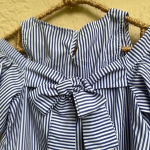 Stylish cold shoulder dress with blue and white stripes. Features a bow detail on the front & Back