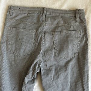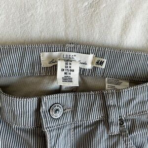 H&M brand LOGG, light blue and white striped railroad pants, size 14. Straight leg verging on boot cut, high rise, very flattering with a little stretch to them. Great for work, casual, or vacation.