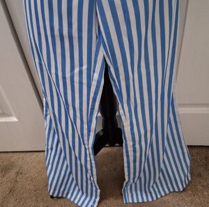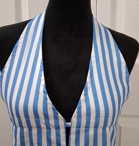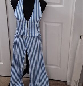 Stylish halter top/pants ties at the waist & neck. Elastic waist pants with blue and white stripes. Perfect for summer outings.