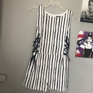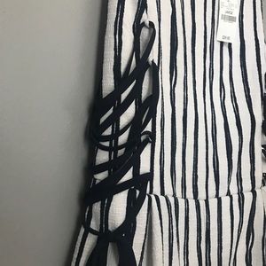 Blue and white romper with criss cross strings on the side. New with tags. Side zipper