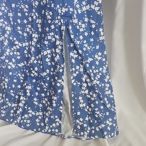 Embrace a relaxed vibe with this blue and white midi sundress, designed for casual and resort wear. The trumpet silhouette is enhanced by a chic slit and ruched detailing, offering a blend of style and comfort. Its flowing design and lightweight fabric make it perfect for leisurely outings.