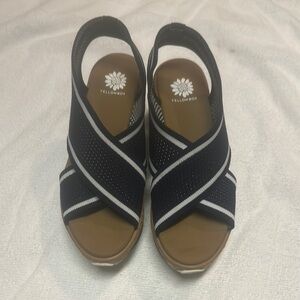 These chic wedges boast a vibrant blue and white color palette, enhanced by a comfortable cross-strap design. The wide, soft straps provide a secure fit, while the light tan sole offers excellent support for everyday wear.