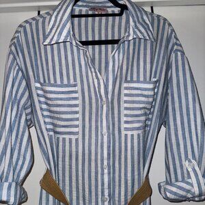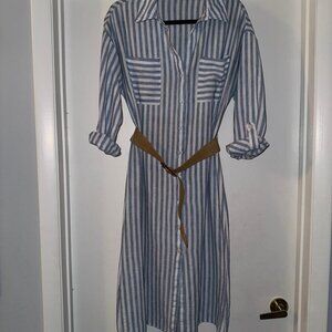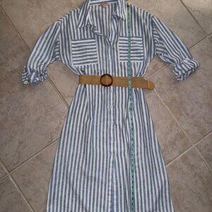 Blue and White stripe shirt dress midi with tan belt size medium 6-8