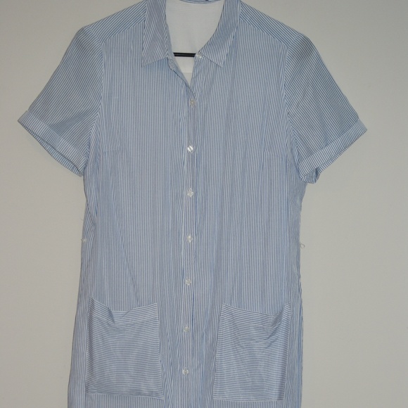 Beautiful white and blue striped dress. There is one small stain beneath the right pocket I have included a picture of that.