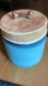Stylish, handcrafted pottery blue and wood dog treat jar with a silver bone handle.
