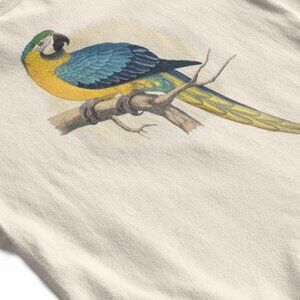 Our designs are printed in-house on sustainably grown and ethically harvested US cotton. This avian shirt features Vintage British wood engraved art of an Ara ararauna tropical bird. The blue-and-gold macaw belongs to the family Psittacidae. Native to South America, this species is notable for its vibrant blue wings and back, contrasting with a striking yellow underside. One of the larger parrots, it surpasses many in size, measuring up to 34 inches in length. Its distinctive facial patch is bare and white, often lined with small, black feather lines.