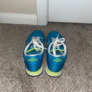 Stylish blue sneakers with yellow accents. Perfect for casual wear.