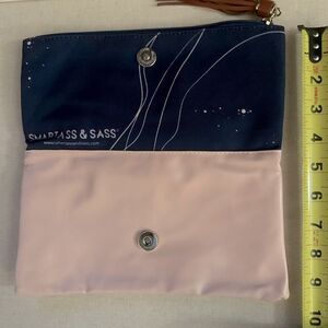 Blue fabric w pink leather fold over clutch pouch w zipper close. Fabric top has pink spatter and pink writing “Don’t Kill My Vibes”. The bottom half is pink leather. Tassel on zipper close. NWOT