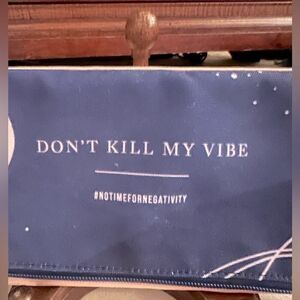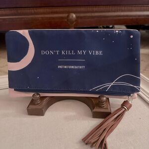 Blue and pink fold over zipper clutch “Don’t Kill My Vibes”. NWOT