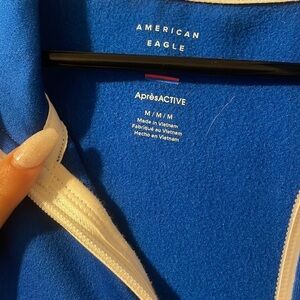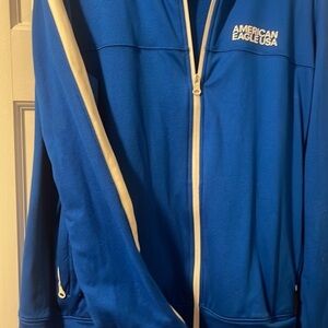 I am in his youth, but in good condition this is a blue and white zip up hoodie. It has pockets on the front of it.