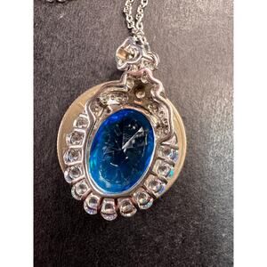 Deep aqua blue cubic zirconia oval cut gemstone prong set in an authentic 925 sterling silver halo setting surrounded by white / colorless cubic zirconia accent stones. Pendant is plated with rhodium over sterling silver. Chain measures 20 inches and is not sterling silver but made of stainless steel with a lobster claw clasp.