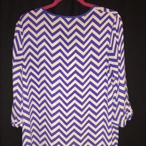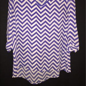 Blue and white chevron. Three quarter sleeves. V neck line. Very light material. Very flattering. In perfect condition. A long blouse. (Covers the booty)