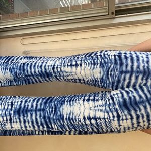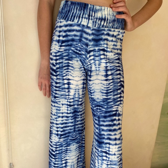 These loose-fitting, bell-bottom pants are great for a casual day or to wear to the beach. They have an elastic waist and are a stretchy material. The blue and white pattern is unique and the flare bottoms also add to the look.