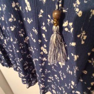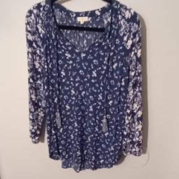 Blue and white floral print boho top long sleeves rounded hem line.