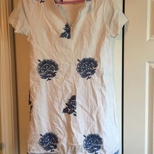White shift dress with large blue flowers on it. Blue patterned hem lining. Keyhole button in back. SUPER ADORABLE purchased at Old Navy and worn once. Only letting go for right price
