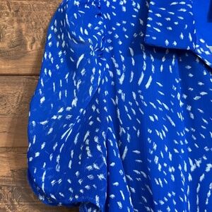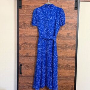 This is a lovely, flowy dress with sheer sleeves and an attached belt that can be removed if you want to wear your own belt. Has a hidden side zipper for easier on and off. Comes from non smoking, no pets, fragrance free home so great for those with chemical sensitivities. This dress has never been worn.
