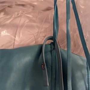Baby blue dress with white bust area and gems. Lace up back with small zipper and clasp (both intact). Fluff/crinolin (?) sewn underneath. I think the shoulder straps are removable