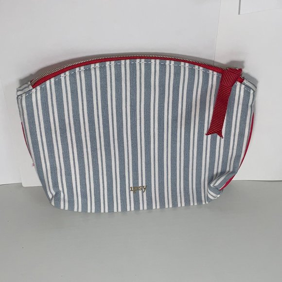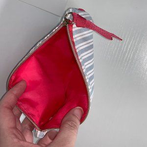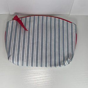 This bag is blue with white stripes. The blue looks like faded denim. The zipper is silver and the zipper pull is a hot pink ribbon. The inside of this bag is hot pink lining. This bag measures 7" wide and 5 1/2" tall.