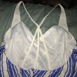 This dress has a blue and white chevron pattern and a cut out back. There is a slit in the front that starts at about knee level