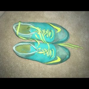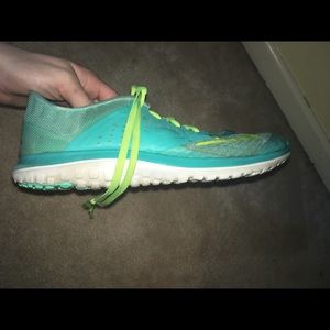 These are blueish green and yellow nikes. They are well loved and in good condition other thank the fabric is dirty. I haven't tried to get it out so after a wash im sure the dirt will come out. Make me an offer!