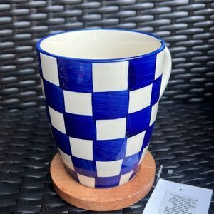 The mug is a ceramic cup with a bold, checkered pattern. The checks are alternating cobalt blue and white, giving it a graphic, eye-catching look. It has a classic, sturdy shape with a matching white handle. The mug is sitting on a small, round wooden coaster