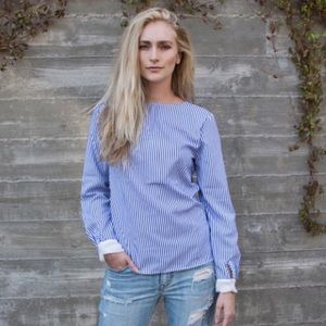 Get fresh in stripes. The Angeles Top comes in blue and pink, and features an open back, tied together. *70% Cotton 30% Polyester *Runs true to size *Model is wearing a size S *Hand wash or dry clean *** not reformation siting for views only