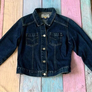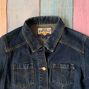 Blue asphalt dark blue denim jacket size large fitted style. In good preowned conditions. Small white paint specs as shown in pictures. No stretch. No rips.