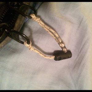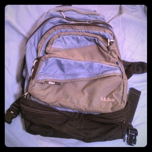 Light blue backpack with grey and black accents. Used with one missing zip pull and two very minor holes (pictured). Still functional and can hold a good amount of things.