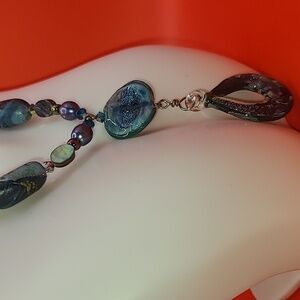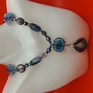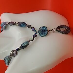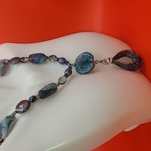 Blue beaded necklace. Gold and silver tone beads mixed in. Vintage. Pre-owned condition. No Maker's mark. I'm unsure of what the beads are made of. The length of this necklace is twenty-two inches.