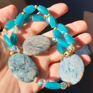 Blue beaded necklace with gold colored beads. Set of 2 necklaces boho classic