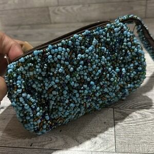 Blue beaded wristlet purse, it’s used and in ok condition. The purse is beaded with blue, green and brown tone beads. It’s used and missing some beads on the strap as you can see. It comes from a smoke free home.