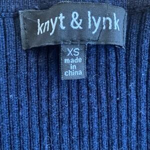 Dark blue bell sleeve V neck ribbed knit sweater with snap buttons, Knyt & Lynk. Preppy, academia style. Size XS. Pit to pit measures 13", pit to hem measures 16.25". Made of stretchy material. Great condition pre owned.